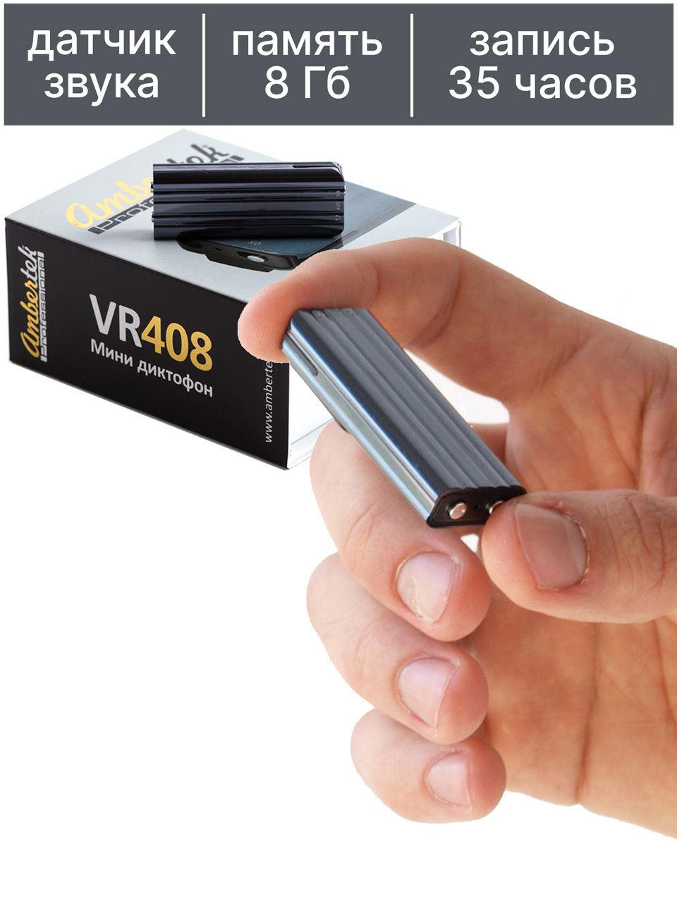- Мини диктофон Ambertek VR408 работает в режиме записи звука, если наушники не вставлены в разъем. Для начала записи переведите переключатель мини диктофона в положение ON - световой индикатор загорится красным, мигнет 4 раза и погаснет - мини диктофон осуществляет запись звука.
